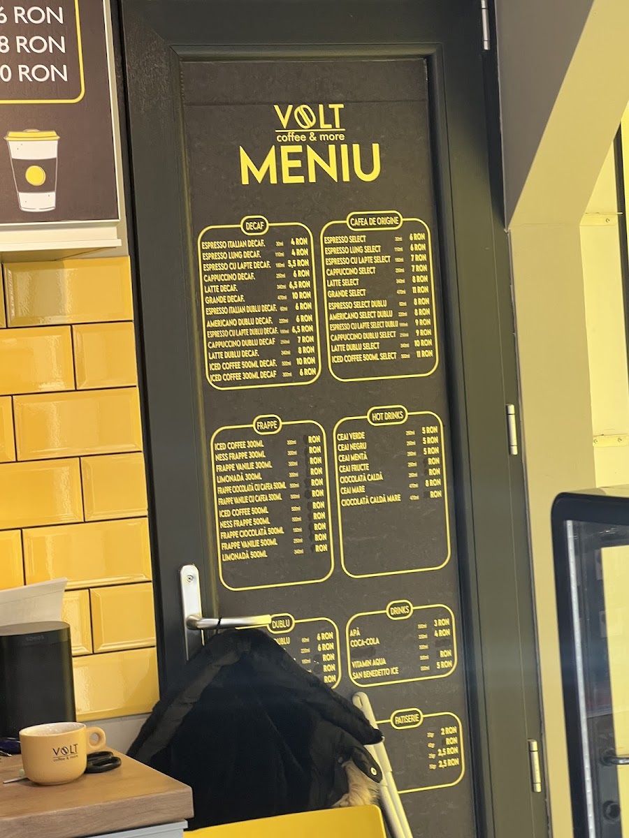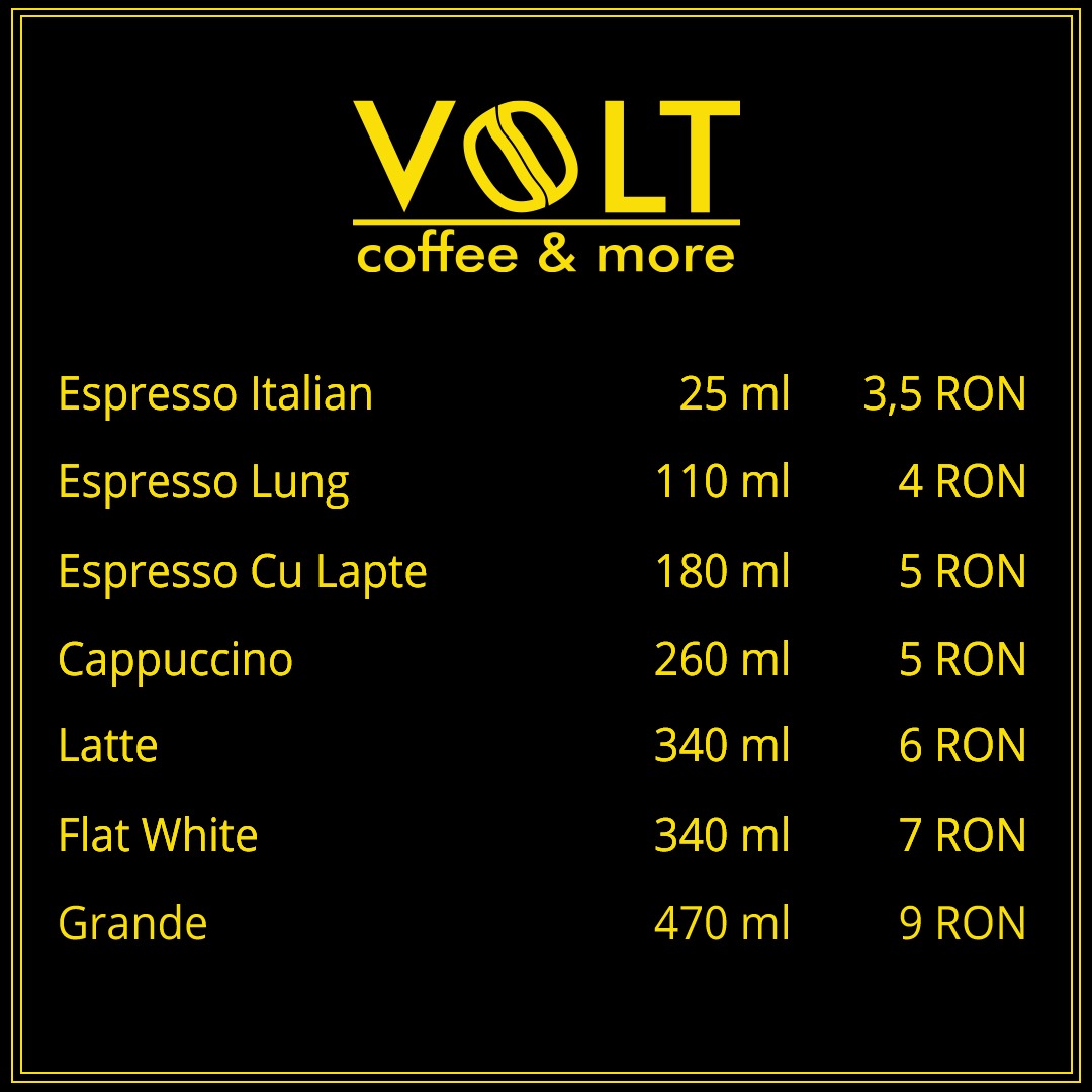 The menu at Volt Coffee - Centru primarily features a selection of coffees and related beverages, including specialty options such as cappuccino. Alongside coffee drinks, the menu typically includes other hot and cold beverages suitable for coffee breaks or casual visits.